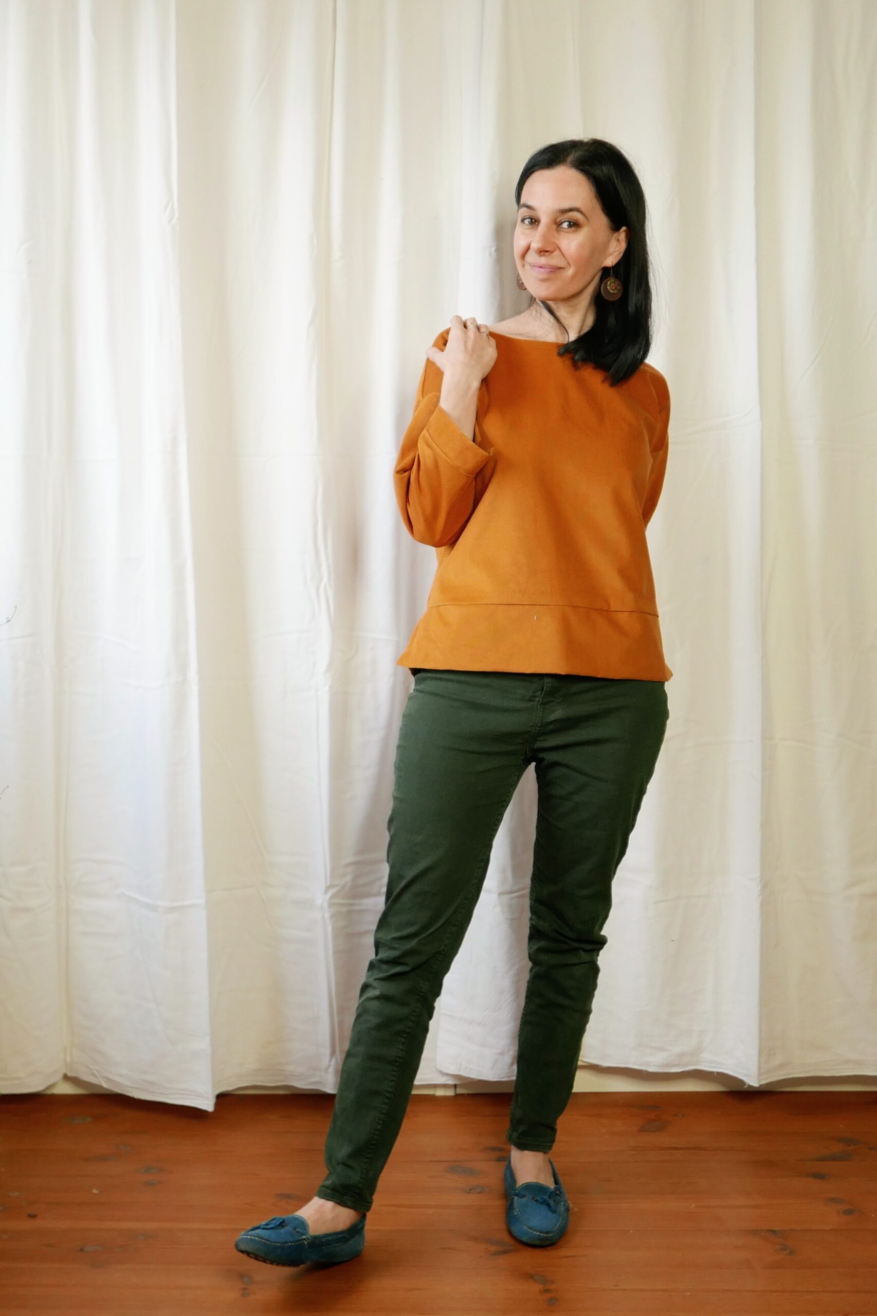 Modelki na zdjęciach noszą rozmiar S, a prezentowane bluzy są w rozmiarze S i kolorach: butelkowa zieleń, imbirowy, wrzosowy.