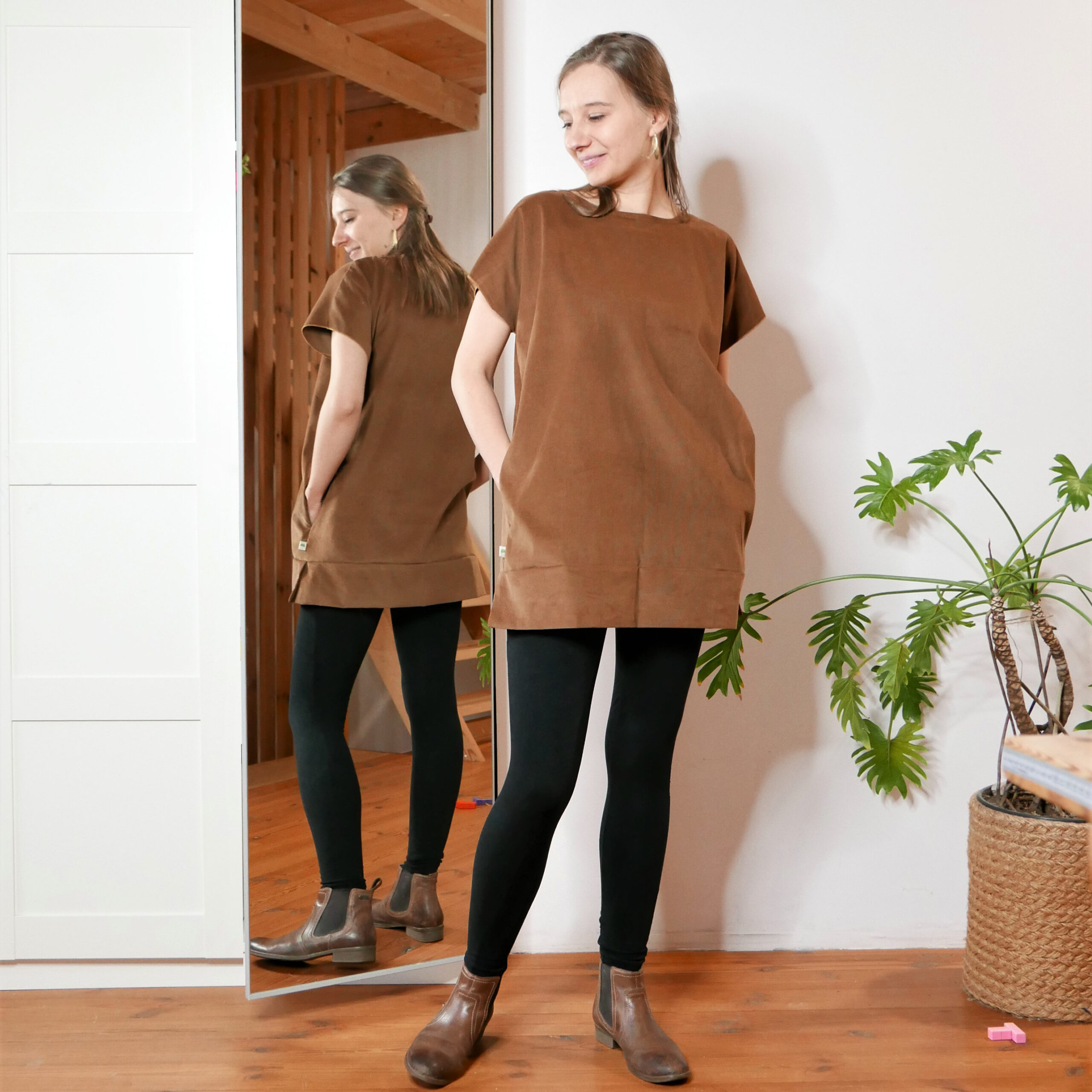 Modelka na zdjęciach nosi rozmiar S, a prezentowana tunika jest w rozmiarze M. Kolor: toffi.