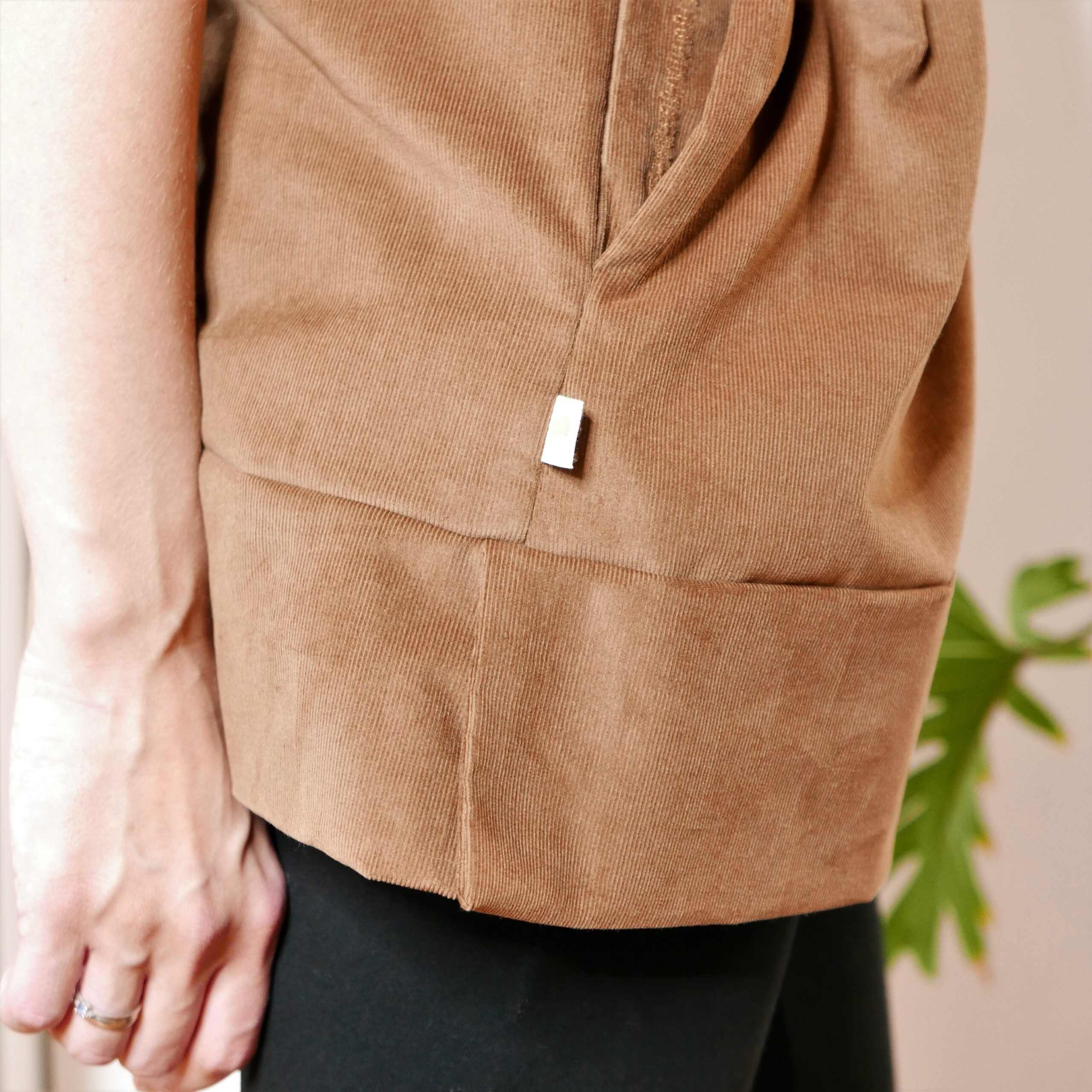 Uszyta jest z bawełnianego sztruksu w drobny prążek. Tkanina ta jest delikatna w dotyku i bardzo miękka. Pięknie się układa.
