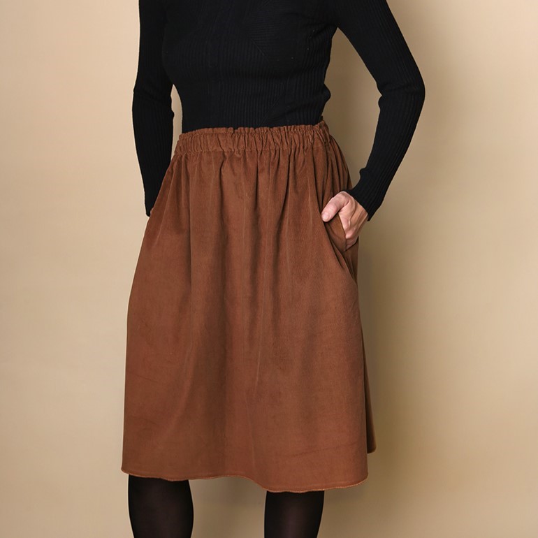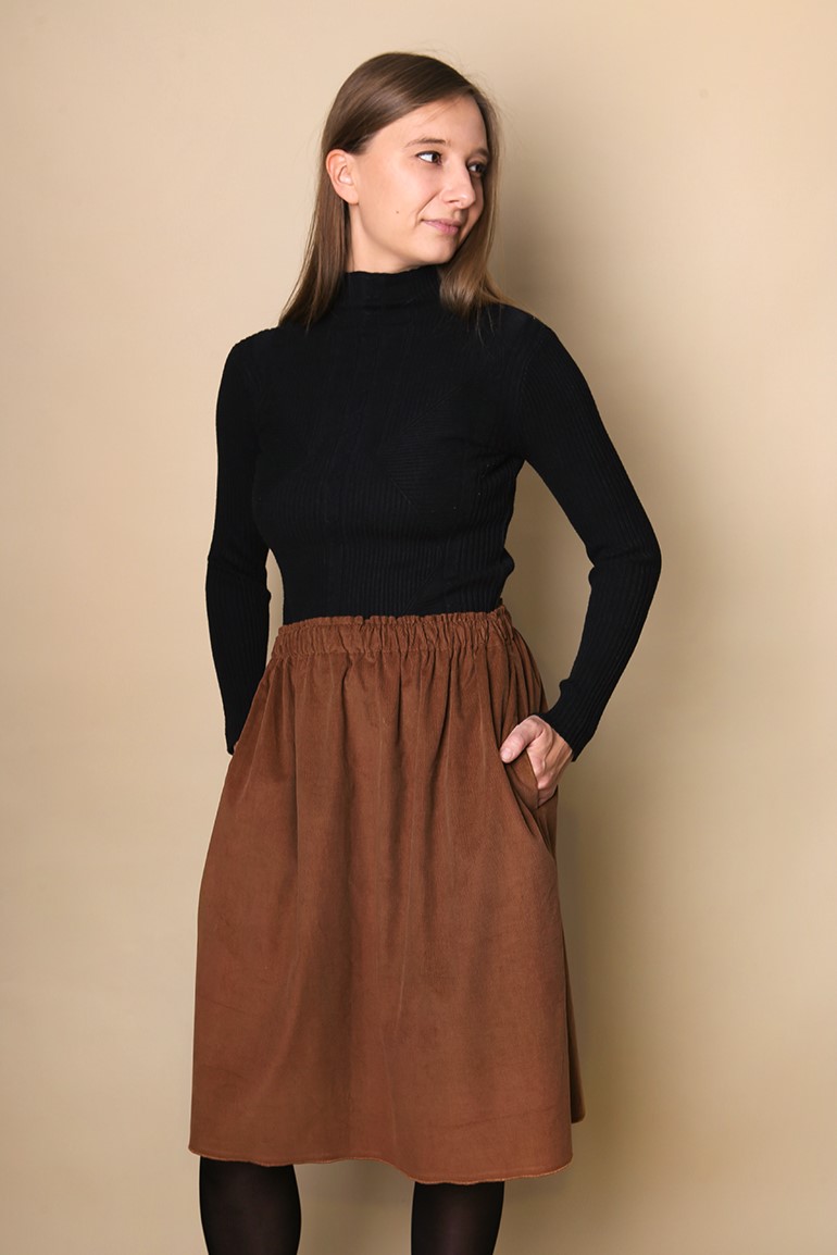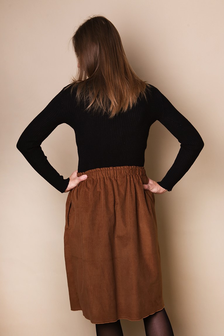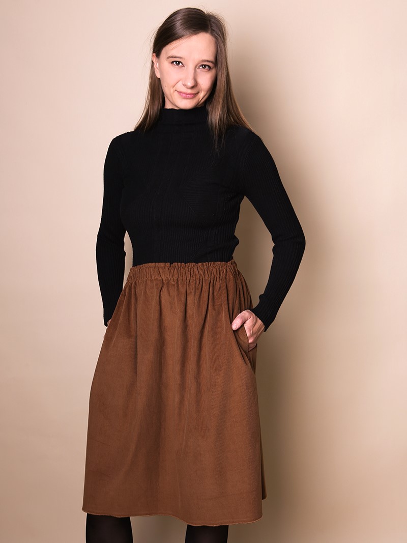 Długość midi to jej super moc – odpowiednia zarówno do pracy jak i na szybki wypad do miasta czy spacer. Wystarczy dodać ulubiony sweter, golf albo ulubioną bluzkę i gotowe. Świetnie pasuje do niej sztruksowa bluza Erica. Możesz wybrać ten sam kolor lub jeden z wielu pasujących z mojej ofercty.