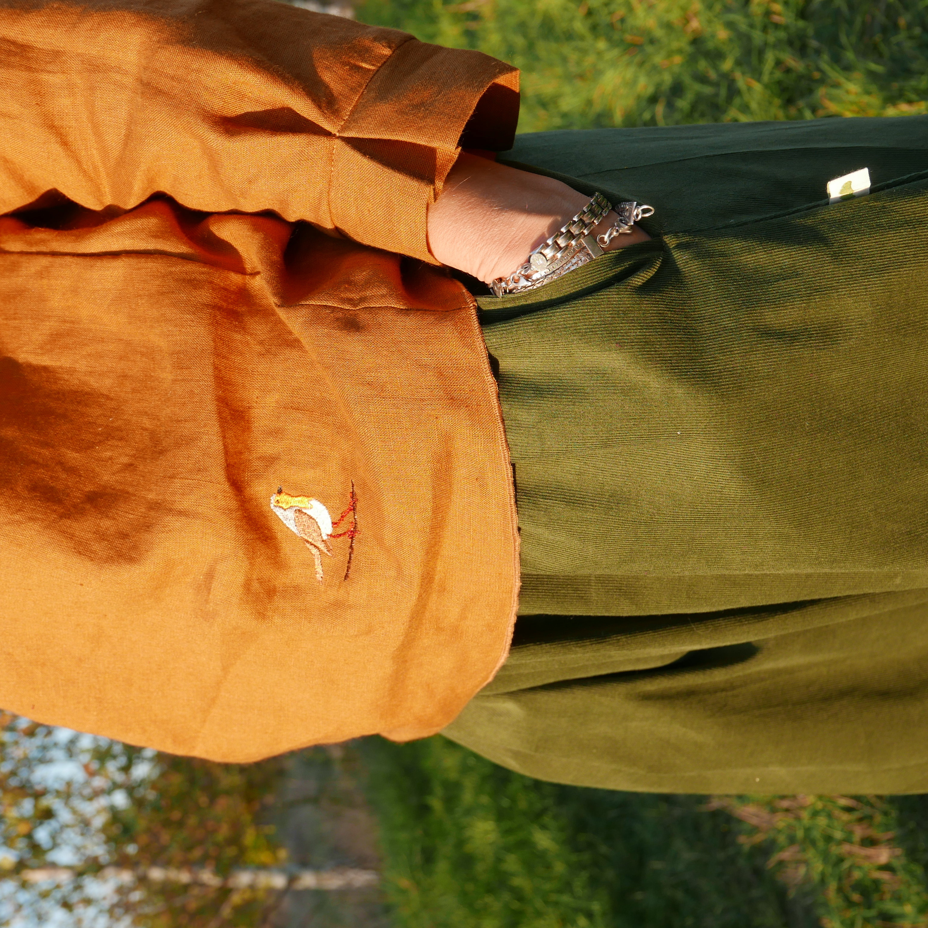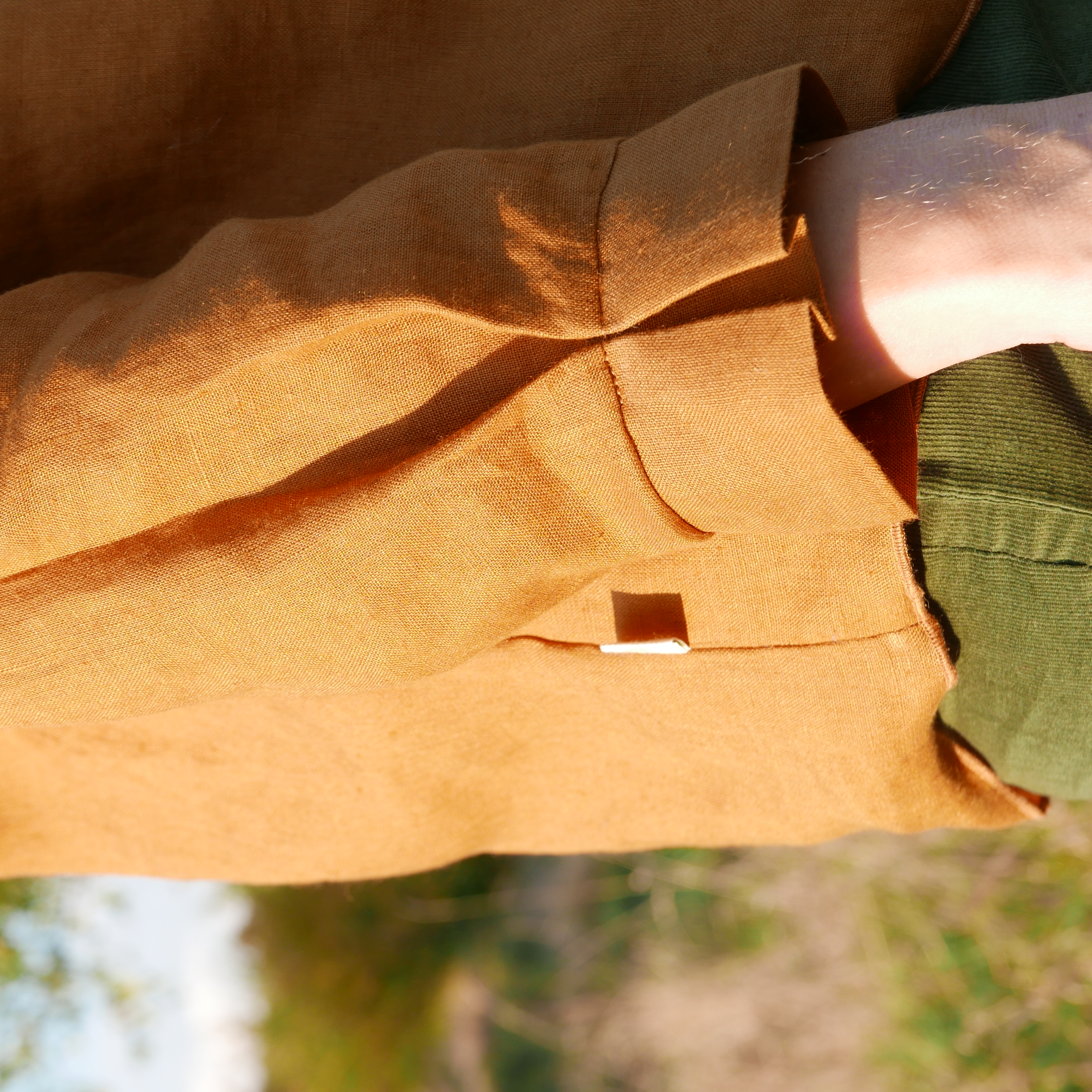Len jest wspaniałym naturalnym materiałem, który posiada antyalergiczne i oddychające właściwości. Tkanina ta jest trwała i mocna. Do szycia używam lnu zmiękczanego i pranego fabrycznie, więc spódnica nie powinna zmienić swoich wymiarów po praniu (kurczliwość wynosi 2%).